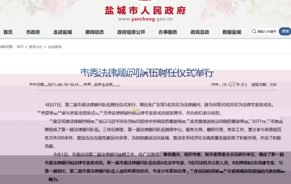 4月27日,第二屆市委法律顧問隊伍聘任儀式舉行,我院院長朱廣東教授再次獲聘鹽城市委法律顧問。