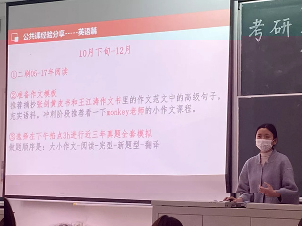 首先,三位學姐依次上台,結合自己的備考經曆,提出自己對初試和複試的寶貴意見。其中,考取上海師範大學馬克思主義理論專業的姜珊學姐針對筆試給出的建議有:明初心,定院校,首先要有一個前進的方向;做好詳細規劃,強調背書等強化記憶的重要性。學姐同時指出考研是一場艱難困苦的過程,需要大家能堅持下去并且保持一個積極樂觀的心态,才能在考試中取得比較理想的成績。
