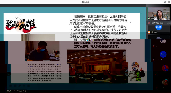 其中法學216班的趙詩涵同學分享的抗疫故事尤為感動,她講到,自己的奶奶已經七十多歲,依然沖在抗疫一線,為醫護人員和志願者義務提供飯菜、進行捐款。奶奶的舉動在感動我們的同時也令我們肅然起敬。