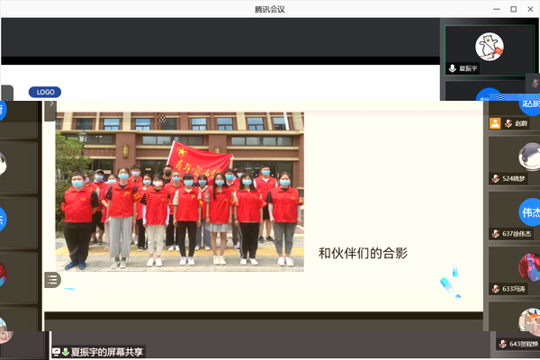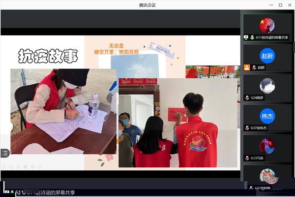 在分享交流活動中,馬燕、夏振宇、王雨欣、徐炜、趙詩涵五位同學化身“故事分享者”講述戰“疫”期間的所行所為、所見所聞、所思所想。他們制作了PPT并以圖文并茂的方式從抗疫故事、志願服務工作、志願服務經曆等方面進行講述,分享自己的抗“疫”心得和真實感悟。