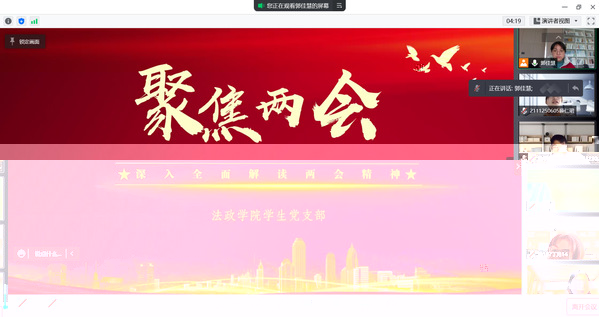 為嚴格貫徹執行黨的組織生活制度,強化學生黨支部自身建設,發揚黨内民主、加強黨内監督,按照學校黨委通知要求,3月23日下午,法政學院學生黨支部利用騰訊會議平台線上開展2021年度組織生活會和民主評議黨員大會。學生黨支部書記郭佳慧老師主持會議,支部支委王川老師、葛偉老師以及全體學生黨員參加了會議。