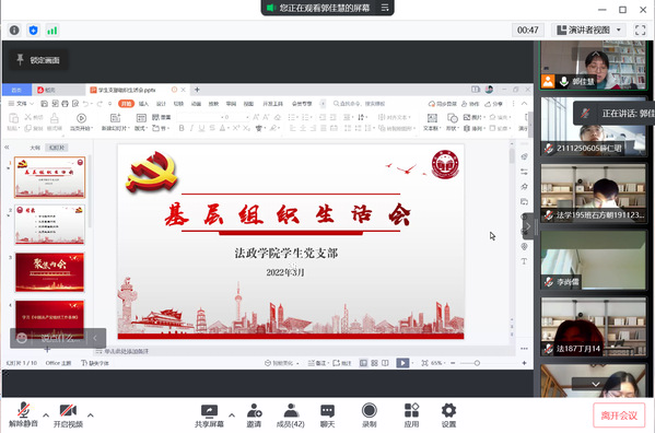 根據疫情防控要求,組織生活會從“線下”改為“線上”,變的是形式,不變的是效果。通過本次組織生活會,進一步增強了學生黨支部的凝聚力和戰鬥力,提高了黨員的理論學習水平。下一步,法政學院學生黨支部将繼續發揮黨支部的戰鬥堡壘作用和黨員先鋒模範作用,以更高的标準、更嚴的要求提升自己,用更優異的成績、更突出的成果迎接黨的二十大勝利召開。