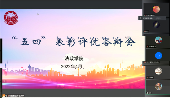 為落實學校“五四”評優文件精神,表彰先進,樹立榜樣,鼓勵我院青年團員争當先進、銳意進取,法政學院分團委于4月8日晚通過騰訊會議平台舉行了線上“五四”評優答辯會。法政學院黨總支副書記高娟、學工辦主任王川老師、學院主要團幹參加并擔任評委,會議由輔導員郭佳慧老師主持。
