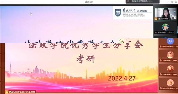 為進一步引導同學們樹立正确的考研目标,堅定考研信心,營造濃厚的學習氛圍,法政學院于4月27日晚7點于線上開展“雲榜樣”考研分享會活動。本次活動邀請18級的陳娟、羅宇華給大家講述她們的考研曆程,法政學子積極參與學習。