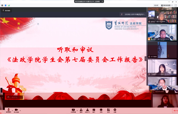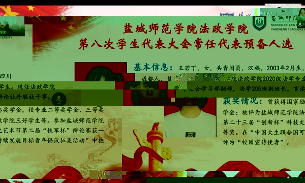 為深入落實習近平總書記有關青年工作的重要講話精神,總結經驗、展望未來,不斷把握機遇、銳意進取,團結帶領全院青年大學生以嶄新的姿态迎接新的任務和挑戰。2022年4月30日晚,法政學院于線上開展了第八次學生代表大會。出席本次會議的有學工辦主任王川、輔導員郭佳慧以及學生代表。