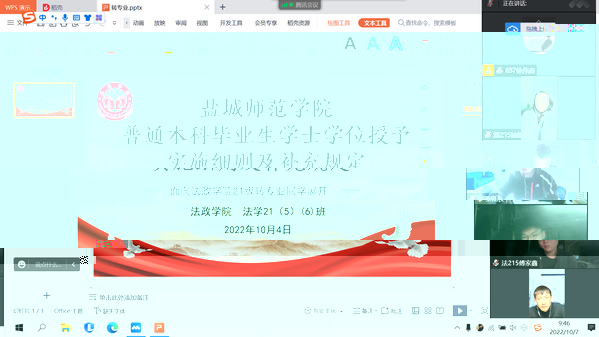 2022年10月5日晚7點,我院于公共教學樓B109和騰訊會議線上線上同時進行普通本科畢業生學士學位授予實施細則及補充規定講解活動。我院學習部部長帶領副部,面向22級新生以及轉專業同學召開此次會議。