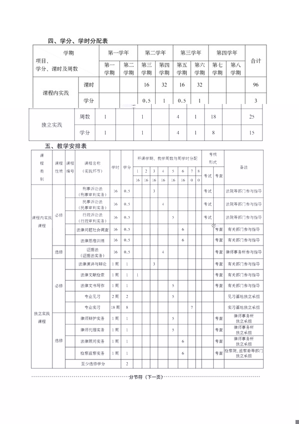 法律演講與辯論、法律文獻檢索、法律文書寫作、專業實習、專業見習、律師辯護實務、律師代理實務、法律顧問實務、檢察監察實務。