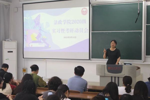 9月18日,法政學院于綜合教學樓A106召開2020級學生實習暨考研動員會。學院黨總支書記馮春芳,黨總支副書記、院長朱廣東,副院長唐萍,教研辦主任賈美豔,實習指導老師出席動員會,20級全體學生參與,本次會議由唐萍主持。