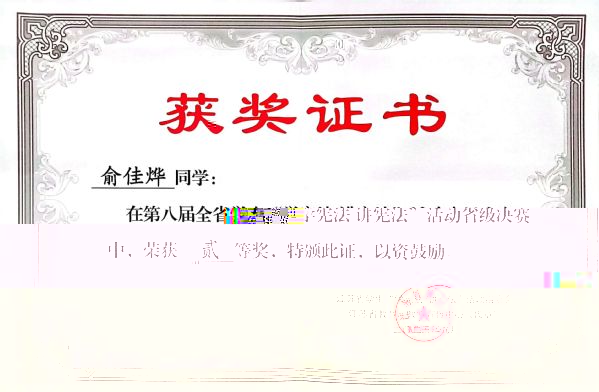 本次“學憲法 講憲法”活動我校從今年8月開始校内選拔,俞佳烨同學通過校賽和省賽初賽進入本次決賽比拼。在校宣傳部副部長徐曉亮帶隊下和周麗、郭佳慧兩位老師的指導下,俞佳烨同學兩天一夜争分奪秒、精心備賽,用法治的信仰和不懈的努力榮獲佳績。