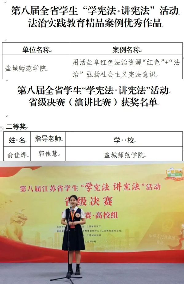 法政學院高度重視憲法學習宣傳教育工作,結合專業特色開展憲法學習與實踐教育活動,在積極組織憲法學習的基礎上,通過舉辦法治講座、模拟法庭、辯論賽等系列活動,豐富師生學習憲法的形式。近日,江蘇省教育廳公布了第八屆全省學生“學憲法 講憲法”活動結果,法政學院俞佳烨同學榮獲演講比賽二等獎,《用活鹽阜紅色法治資源 “紅色”+“法治”弘揚社會主義憲法意識》獲評法治實踐教育精品案例優秀作品。