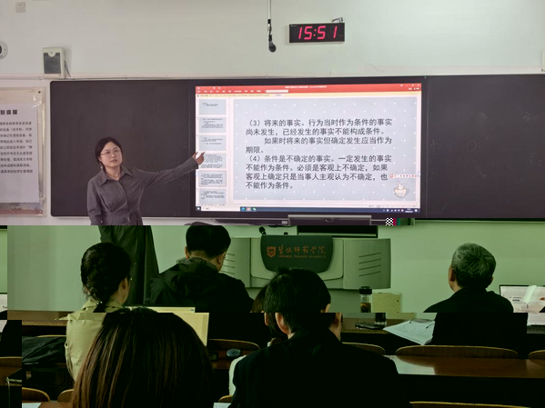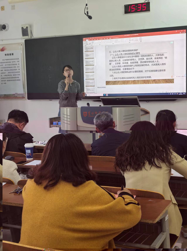 2024年新進教師許曉岑、曹思雨進行了教學展示,她們結合各自的學科特點,精心設計教學内容,巧妙融入課程思政元素,采用智慧化教學手段,關注課堂教學效果的提升。校、院兩級督導及法學專業教師認真聽取教學内容,并結合自身教學經驗對教學内容重難點的設置、課程思政元素的挖掘、教學設計的細節優化等方面進行了評議和指導。丁大晴重點強調要依據“以學生為中心”的原則開展教學活動,增強學生的參與感、體驗感,促進教學目标的實現,根據學生學習成果和反饋進行評價和持續改進,從而形成自己的教學模式,研讨會現場氣氛熱烈。兩位新教師在整理和反思之後都對課堂教學有了更加深刻的理解,對教學改革創新有了更為深刻的認識。