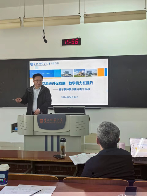 為紮實推進本科教學審核評估工作,提高青年教師教學能力4月24日,法政學院在公共教學樓B211開展新教師教學能力提升活動。學院特邀校級督導丁大晴教授參加活動,院長朱廣東、副院長唐萍、周麗、系主任葛偉及全體教師參加活動。活動由副院長周麗主持。