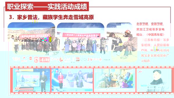 從大學之初,我就開始職業探索。作為江蘇财經法律援助中心學生志願者協會負責人,我和我的同學們積極奔走在普法宣傳和法律援藏的道路上。校内新生普法宣講如火如荼。校外講師團送法進社區、入學校,讓法治觀念入人心。