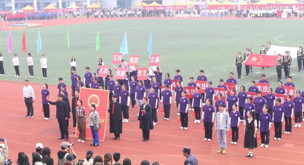 開幕式上,伴随着激昂的音樂,法政學院代表隊以飽滿的精神姿态走向主席台。聽,“與法同行,知憲于心;德法兼修,知行合一”的口号是他們的專業素養;看,步伐铿锵、整齊劃一的隊列是他們的精神風貌。紫色着裝體現着法律的公正和威嚴、法律人的公平和正義;手持五星紅旗,表明法學生學法為國,一心向黨的信念。方陣在主席台前站定後,出場的是法政學子們精心排練的法律小話劇,生動的表演,感染的話語,無不彰顯着法政學子對憲法和法律的堅定信仰,對傳播法律知識的堅定信念,對法治建設事業的堅定決心。