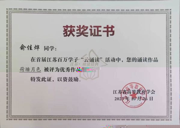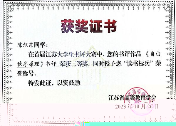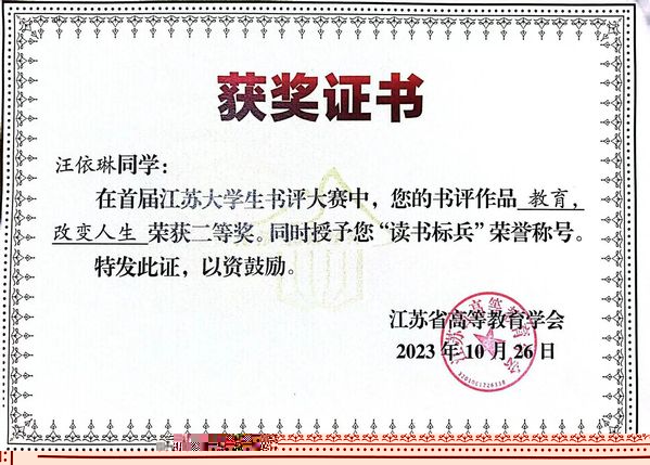 近日,由江蘇省教育廳主辦,江蘇省高等教育學會協辦,南京師範大學承辦的首屆江蘇大學生書評大賽結果揭曉,根據《關于舉辦首屆江蘇大學生書評大賽的通知》(蘇高教會〔2023〕13号),經專家評議、評審委員會審定,共評選出獲獎作品200個,其中特等獎10個,一等獎44個,二等獎146個。我院法23(3)法學魯潔獲得一等獎,法23(3)法學汪依琳、法22(2)法學陳旭東獲得二等獎;同時,在百萬學子“雲誦讀”活動中,法22(1)法學俞佳烨的誦讀作品《荷塘夜色》被評為優秀作品。熱烈祝賀他們!