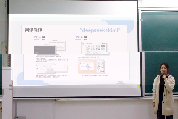 活動中,宣傳部成員詳細講解了Deepseek、Kimi和Xmind等常用 AI 工具的操作技巧,并展示了AI技術在多場景中的應用,分析了其對法學領域的潛在影響。通過現場演示“Deepseek+Kimi”疊加制作PPT,同學們對AI的實際應用有了更直觀的理解。宣講團鼓勵大家緊跟科技潮流,将AI技術融入法律學習,制定個性化學習路徑,提升專業能力。